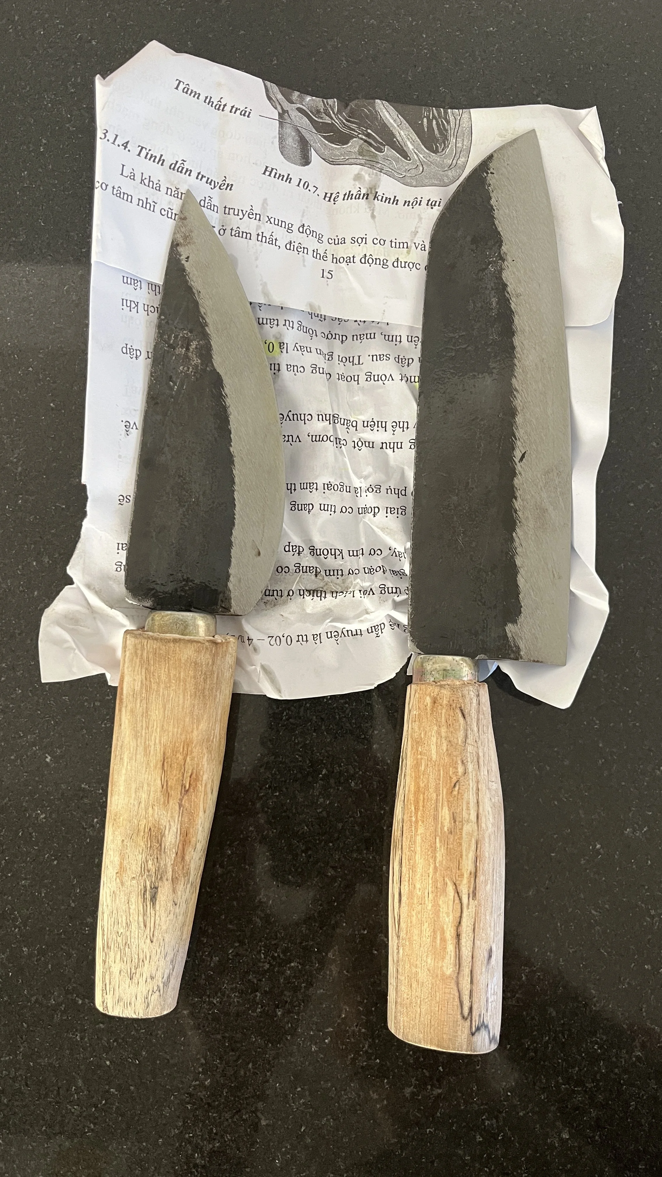With the handle on and the blade honed, the final step was to get the final edge on it with a limestone block. This was a tricky proposition! Amber and I did the best we could with our limited muscle memory, but left the final final sharpening to our Vietnamese obi wan. We both decided we would rather have the sharpest knife possible, done by an expert, than a semi-jabroni version that was done by us. Start to finish, the process took about 3 1/2 hours.